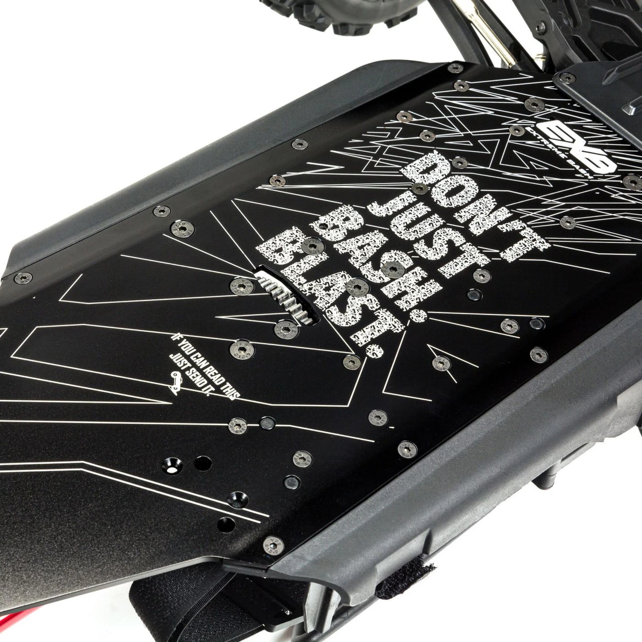 Durable steel driveshafts plus all-metal diff outdrives and gearbox internals keep the heavy-duty 4-wheel drivetrain rolling over punishing tracks. An Extreme Bash toughened suspension system smooths the ride, with a steel rear suspension mount and adjustable oil-filled shocks mounted on 7075 T6 anodized aluminum front and rear shock towers.