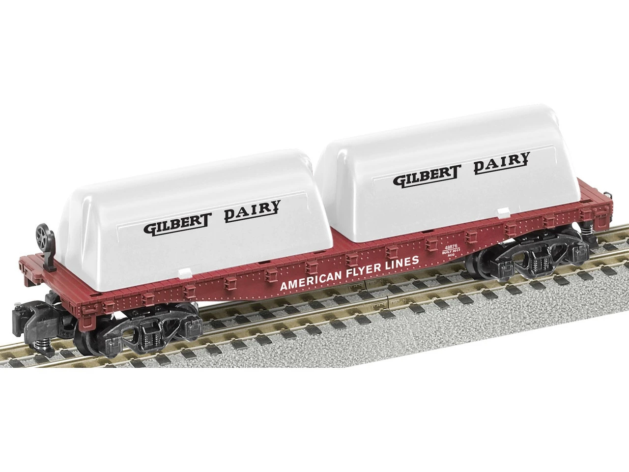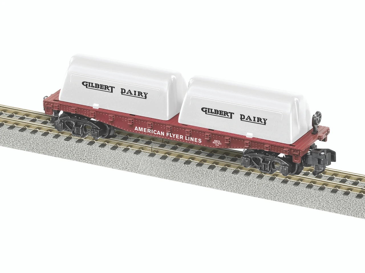 This is the American Flyer Flatcar with Gilbert Dairy Milk Containers from Lionel. Suitable for Ages 14 & Older. FEATURES: Compatible with any American Flyer train equipment Die-cast metal trucks and operating couplers Load of two removable containers included INCLUDES: One American Flyer Flatcar with Gilbert Dairy Milk Containers REQUIRES: American Flyer train equipment Adult supervision SPECS: Scale: American Flyer/ S Gauge Length: 9-1/2″ (241.3mm) Minimum curve: S-36 COMMENTS: Due to small parts that could cause a choking hazard please keep away from children 3 years of age and younger