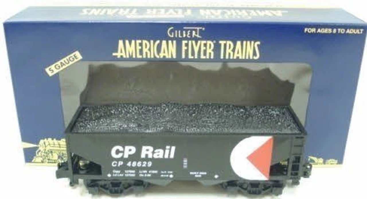 This is an American Flyer Canadian Pacific 2-Bay Hopper from 2006. This hopper features die-cast metal trucks, die-cast metal operating knuckle couplers, metal wheels and axles. Manufacturer: AF. Model Number: 6-48629. Years Manufactured: 2006 – 2006. Road Name: CP. Scale/Era: S Modern. Model Type: Freight Cars.