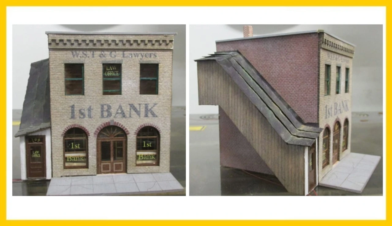 A prefect small brick building for that downtown main street. Includes interior parts including a partition wall with teller windows, two tables for the lobby and interior lighting by a supplied LED light.