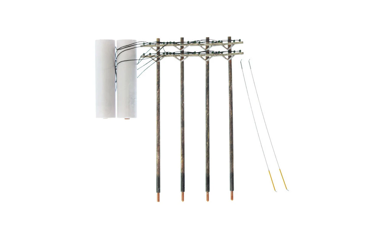 Each pole is placed approx. 80 scale feet apart or 20″ (50.8 cm) in O scale.